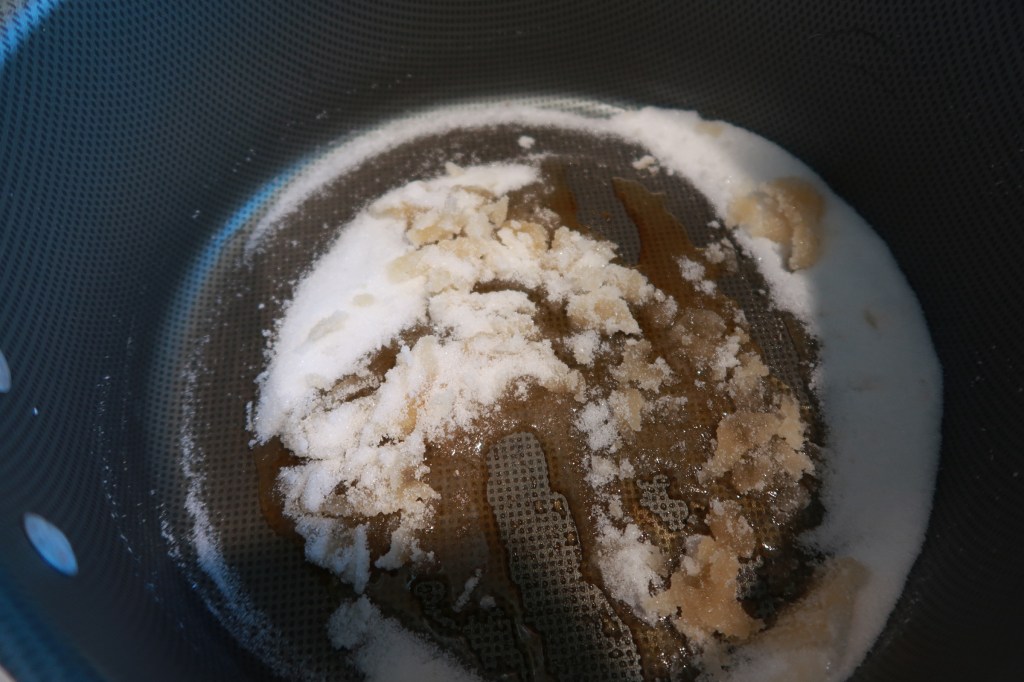 Note: You want to avoid overcooking the sugar once it reaches that amber color. During this process you’ll need to stir vigorously. If needed you can take the pan off the heat for a few seconds if you think the heat isn’t going down fast enough. Bring the pan back to the stove while stirring the mixture and move on to step 2.