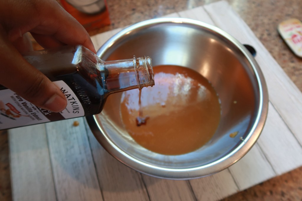 Step 4 is to strain the mixture and add the Vanilla. You will do this right after step 3 is complete. After the caramel is strained add in the vanilla. Once the Vanilla is mixed in you can place your caramel in a mason jar and use when it has cooled down.