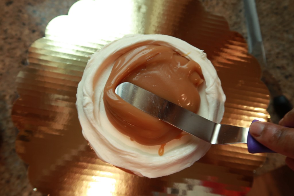 After making the caramel let it sit for an hour or until it is no longer hot. If using on cakes or cupcakes let the caramel set in the fridge for at least 30 minutes. Once it sets it will be the perfect consistency to fill into a cake. To use as a drizzle microwave the caramel in 8 seconds intervals until you have your desired consistency.