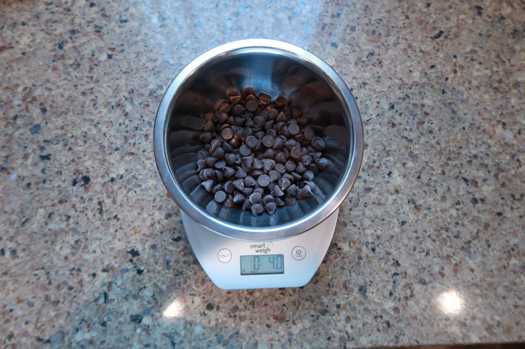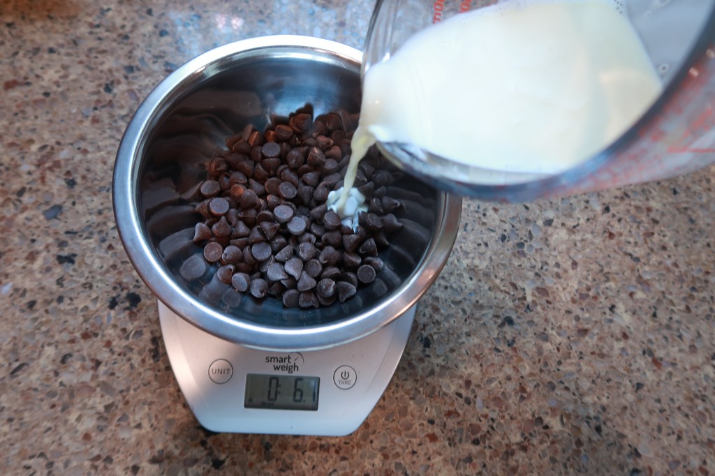 - Step One: Measure out 4oz of your chocolate. Make sure to zero out your scale so you can properly measure your chocolate into the bowl. If you are using a 4oz chocolate bar you won’t need to measure out the chocolate.