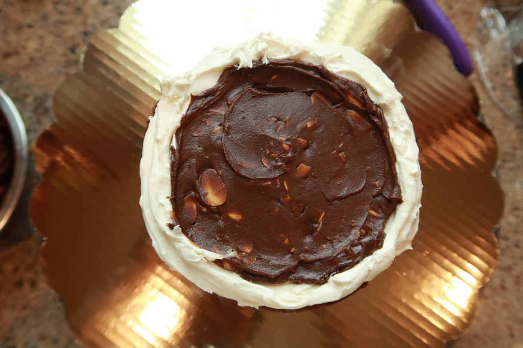 - Cake Filling: Chocolate Ganache makes a lovely cake filling. When I want to fill a cake with ganache I will cool the ganache in the freezer for about 20 minutes. By that time the mixture will be thick but not fully set, making it easy to stack in between cake layers! This is where I like to have fun with additives like Oreo’s or toasted almonds which is shown in the photo below!